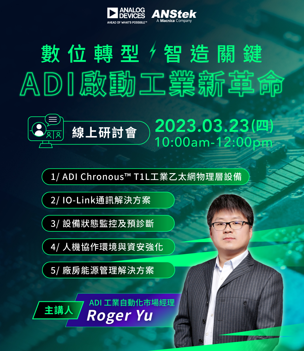 舉辦「數位轉型 智造關鍵—ADI啟動工業新革命」線上研討會,歡迎報名參加!