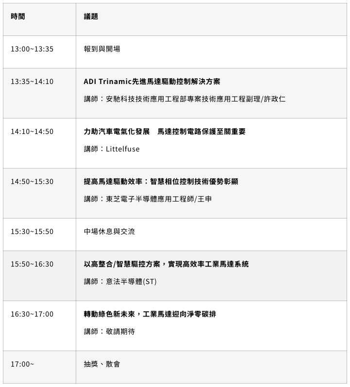 為協助相關開發者掌握最新的馬達電控設計技術,做好因應ESG浪潮的準備,本次活動特別邀請亞德諾(ADI)、利特(Littelfuse)、東芝(Toshiba)、意法半導體(ST)等在馬達應用領域具有代表性的國際大廠,與開發者分享其最新的驅動控制技術,並探討工業淨零碳排對馬達設計的影響,以及未來馬達設計的重要趨勢。內容精彩可期,歡迎即刻報名,搶占有限席位。