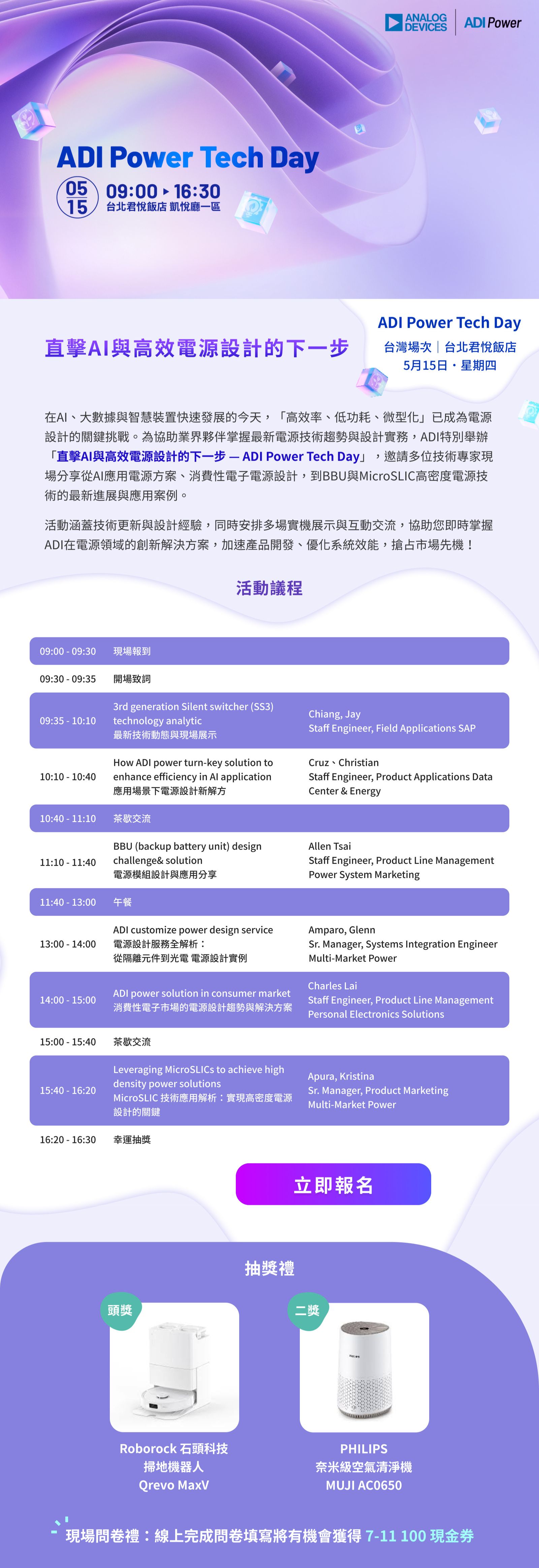 本次活動於 2025 年 5 月 15 日在台北君悅飯店舉行,邀請 ADI 技術專家就高效能模組化電源設計和新世代 AI 產品設計等熱門話題進行深入分享和交流。