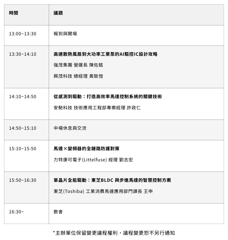 本次研討會將從系統全鏈路的角度出發,深入剖析新世代馬達設計的四大關鍵環節:包括探討如何從電源端到控制端,建構完整的系統防護策略,有效降低意外停機的營運損失;解析高功率直流無刷馬達的驅動設計,破解從功率元件的選型權衡、拓撲架構到散熱設計的實戰攻略,以滿足從AI伺服器到工業泵浦的多元應用需求。此外,也將分享如何透過高度整合的驅動與控制方案,將複雜的設計、調校與驗證流程化繁為簡,無論是步進或三相無刷馬達,都能加速產品上市時程、降低量產風險並優化整體物料清單(BOM)成本。期能提供一套兼具宏觀視野與微觀技術的系統性解決方案,讓您從容應對新時代的馬達設計挑戰。