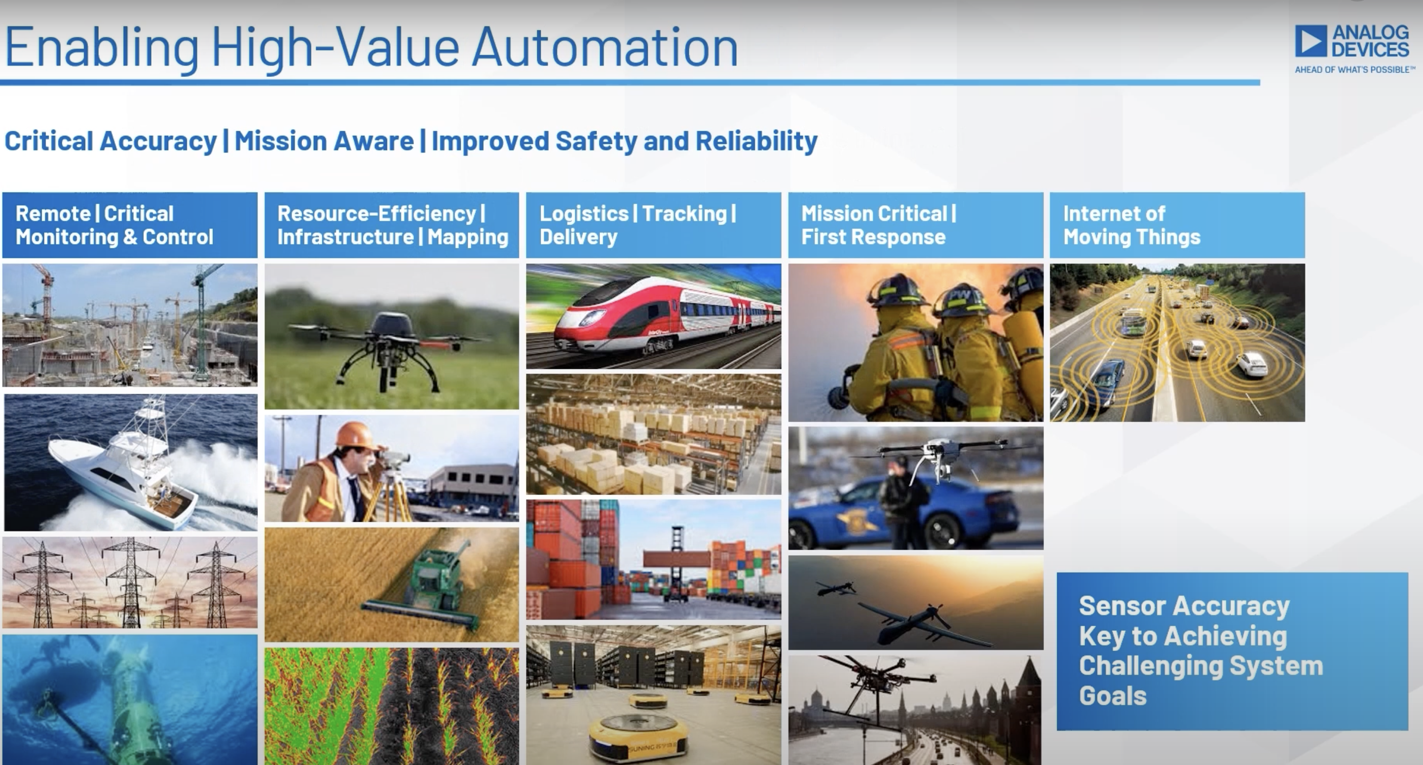 【解決方案】在具有挑戰性環境中的精確姿態感測 在這段影片中,ADI描述了如何利用感測器融合技術,使慣性測量單元(IMU)成為更準確的垂直陀螺儀,以保持GNSS跟蹤和死推算更加精確,特別是在智能農業和智能建設市場。 IMU 垂直陀螺儀 GNSS 智能建設市場 智能農業